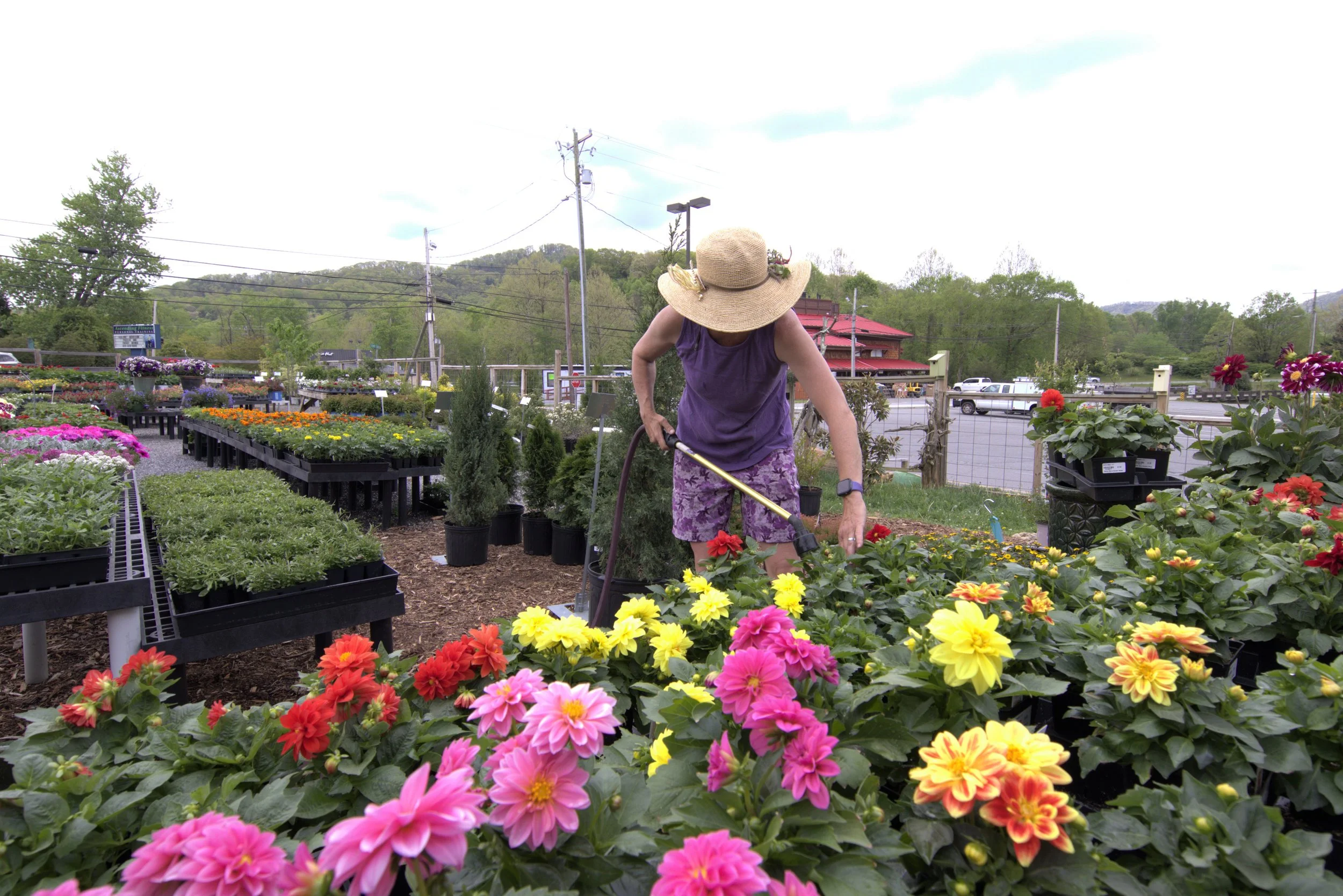 Mellie Macsherry waters flowers in Mellie Mac’s Garden Shack, a nursery and garden center she opened 11 years ago. Photo by Fred McCormick
