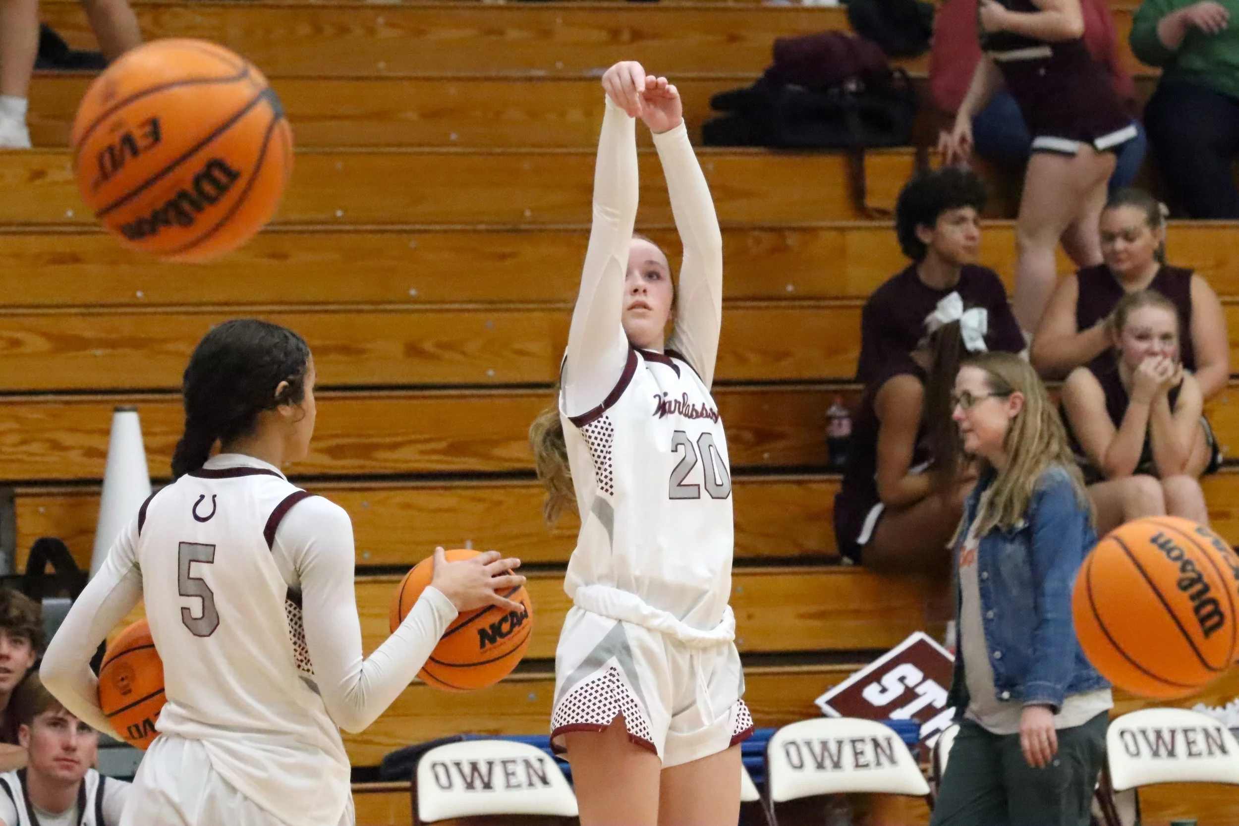 Owen freshman Vanessa Goodhue hoists a 3-point attempt during warmups, Nov. 21, when the Warlassies hosted Tuscola in their home opener. Photo by Fred McCormick