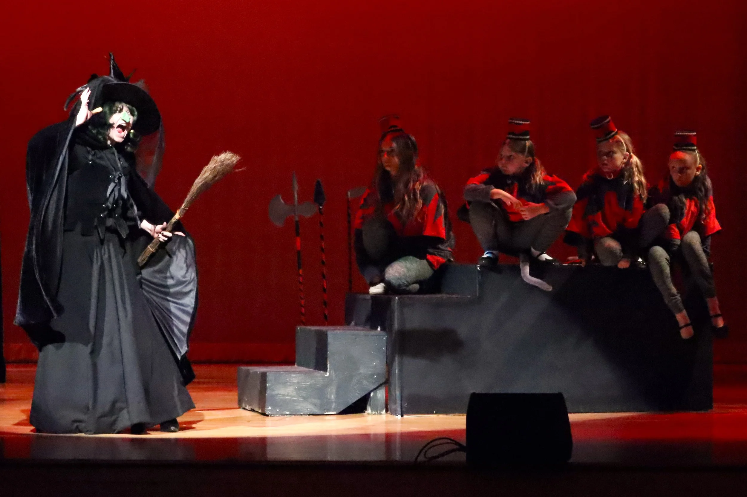 The Wicked Witch of the West, played by Six Coe, joins winged monkeys, portrayed by students from ArtSpace Charter School, on stage, as Owen performing arts students prepare to present “The Wizard of Oz,” April 30 through May 2. Photo by Fred McCormick