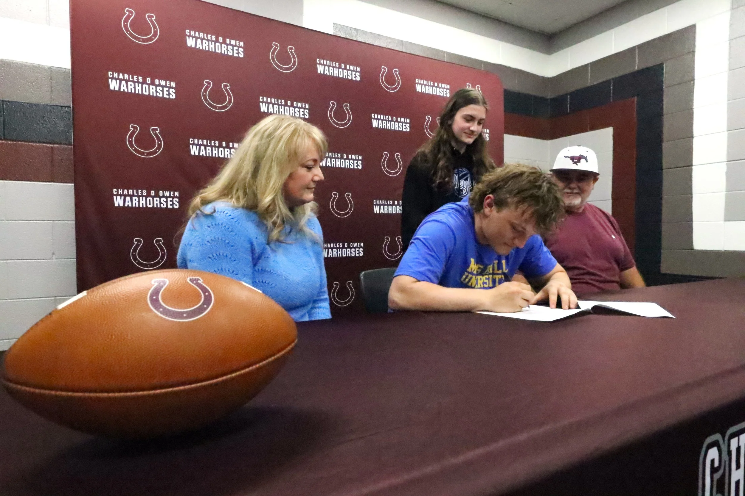 Hayden Burpeau, who lined up at 12 positions during his football career at Owen, will continue playing the sport at Mars Hill University, following a March 27 signing ceremony. Photo by Fred McCormick