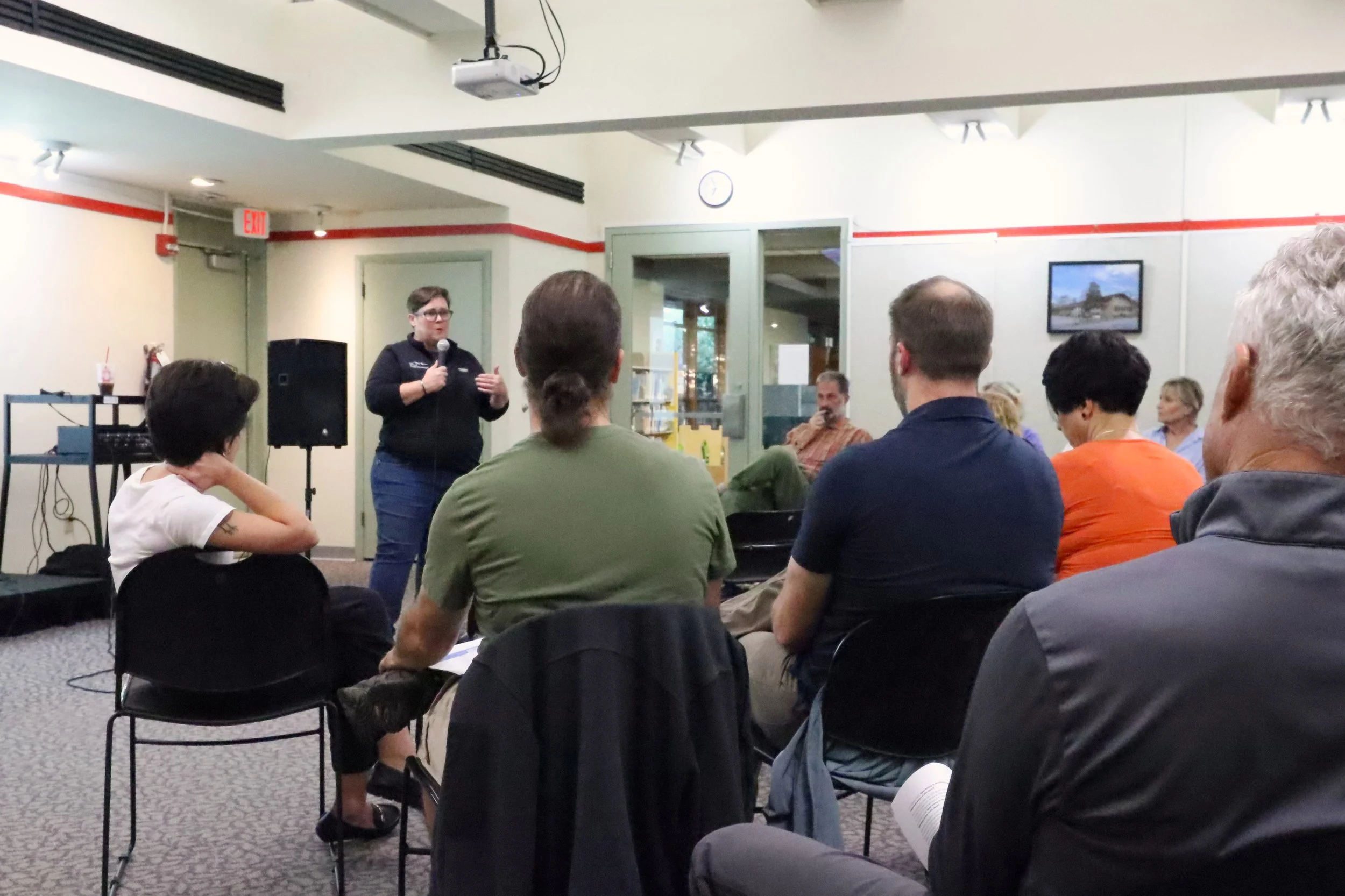 Black Mountain planning director Michelle Kennedy hosts a community meeting, Sept. 3, at the Black Mountain Public Library, where residents discussed a proposal to convert South Ridgeway Avenue into a one-way traffic pattern. Photo by Fred McCormick