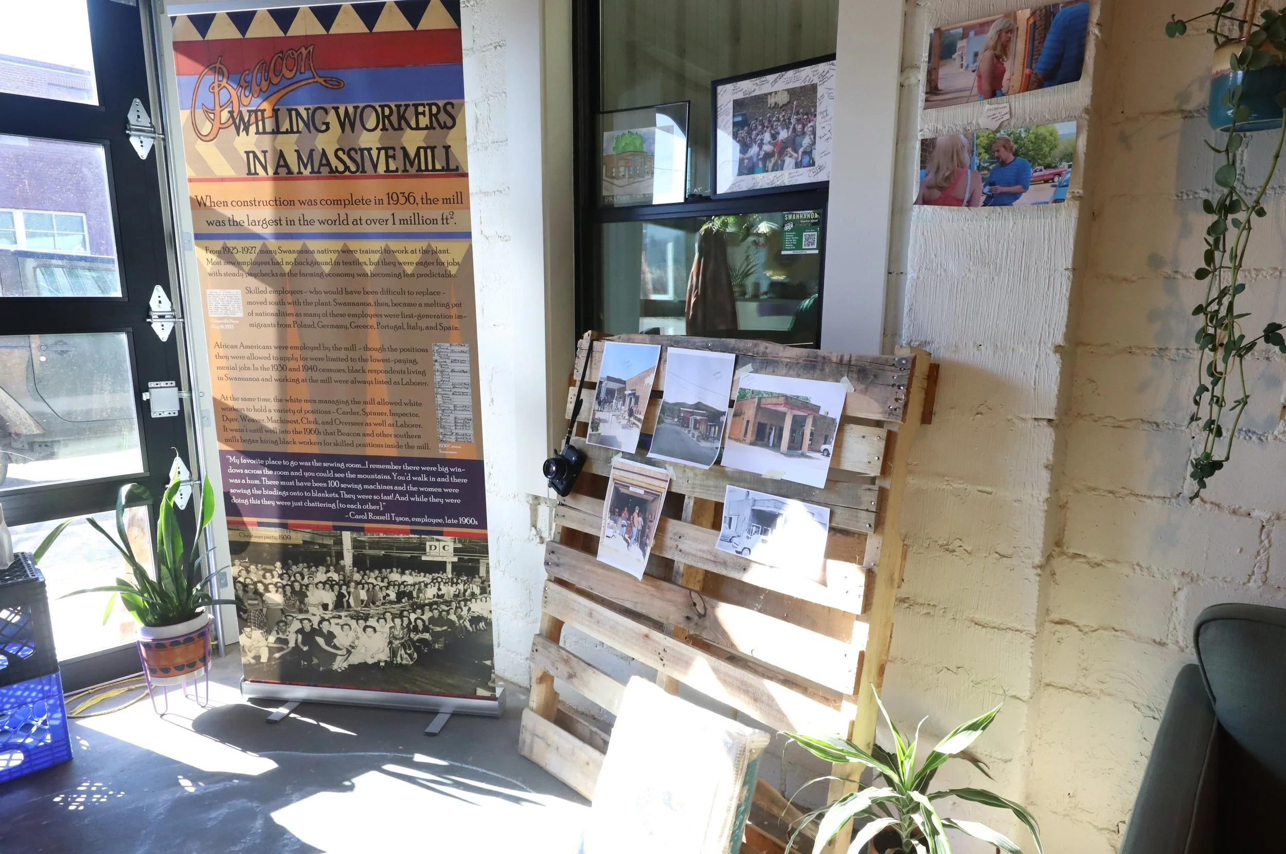 An exhibit in Short Sleeves Coffee commemorates the history of Beacon Manufacturing Co., which once stood across the street from the Swannanoa business. Photo by Fred McCormick
