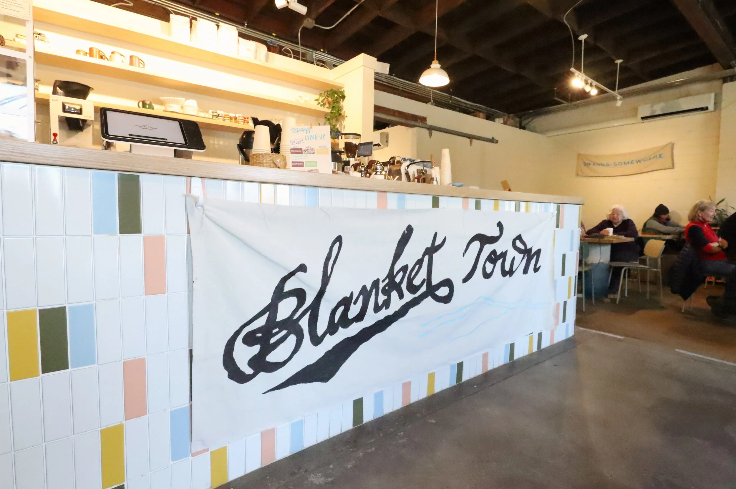 A handmade sign celebrating the legacy of Beacon Manufacturing Co. greets customers as they step to the counter in Short Sleeves Coffee, which introduced its Blanket Town Winter Blend earlier this month. Photo by Fred McCormick