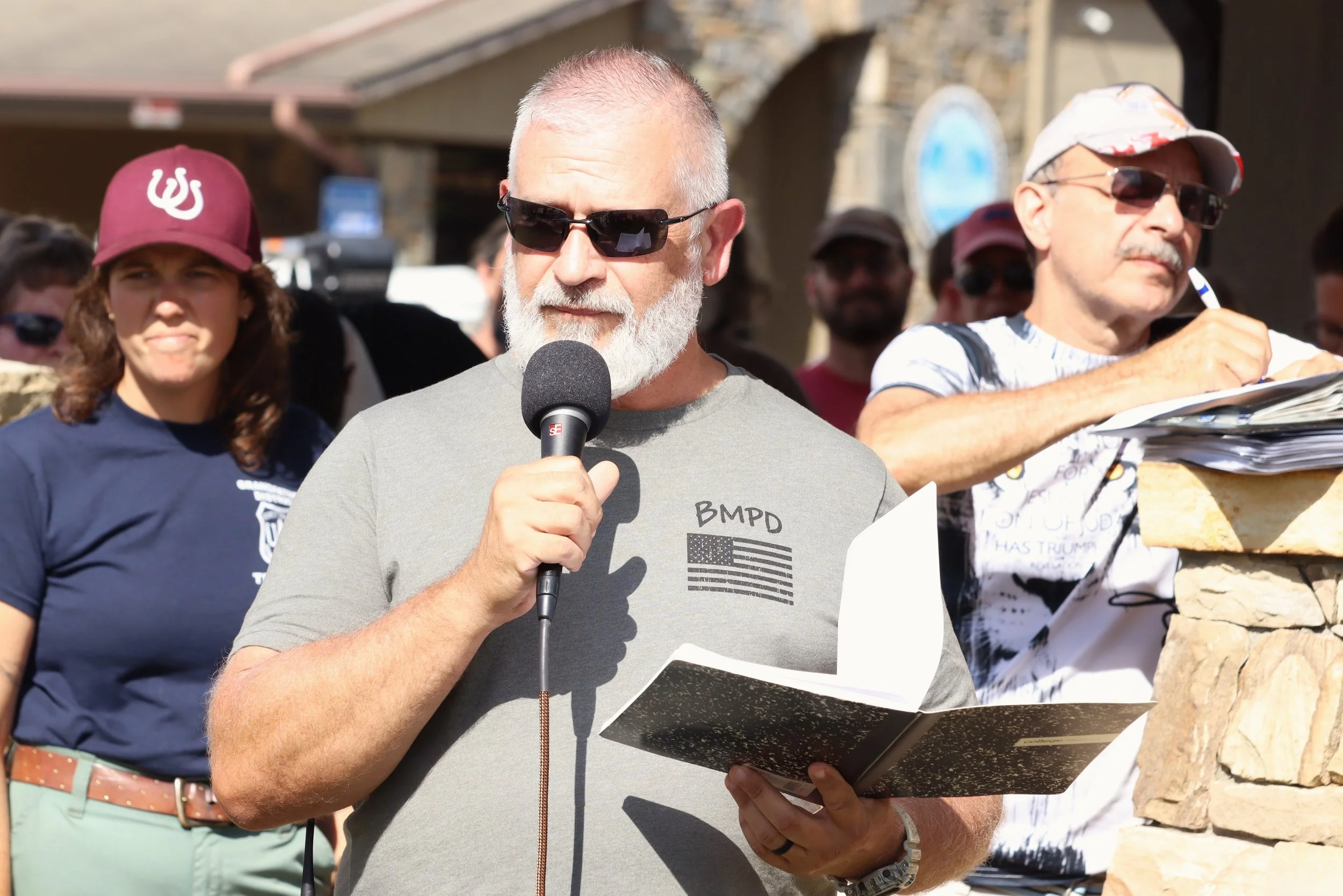 Town of Black Mountain Public Works Director Jamey Matthews provides updates on local utilities in an Oct. 2 meeting in town square. Photo by Fred McCormick