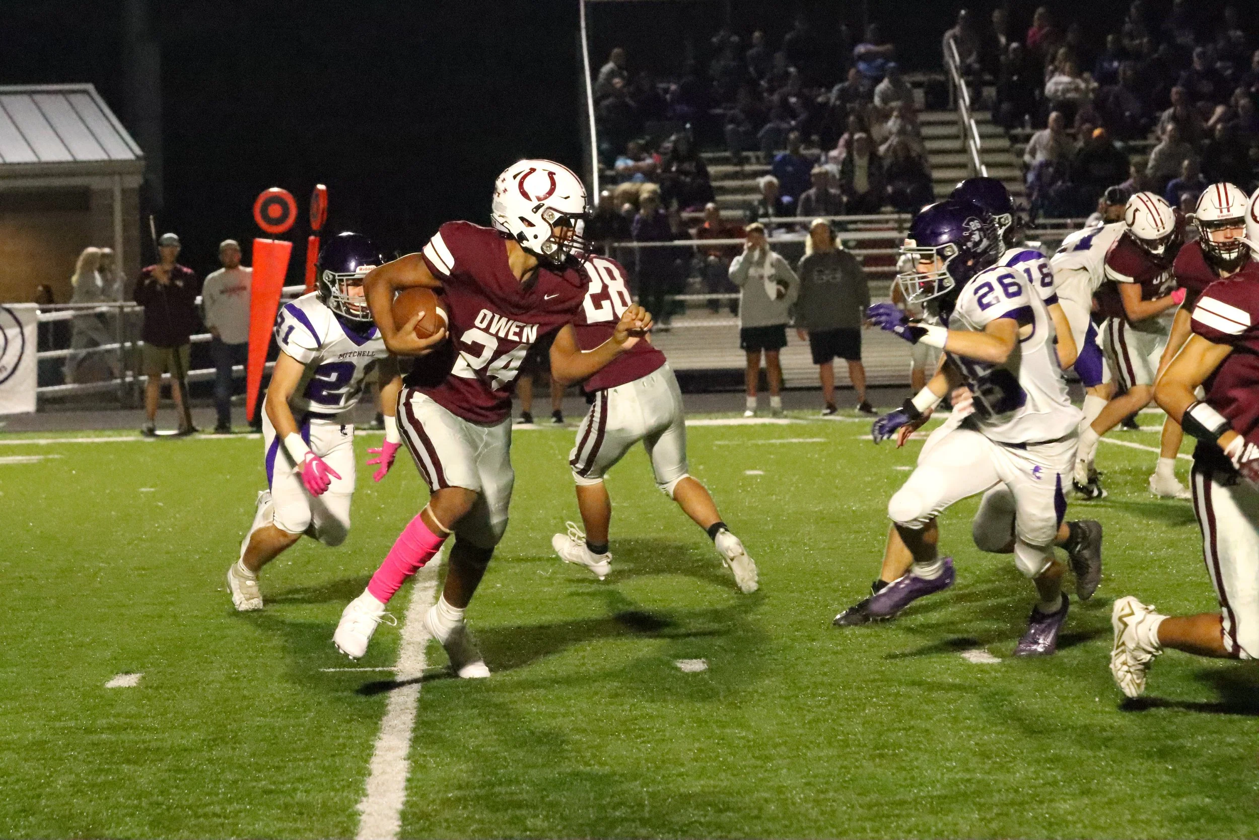 Penalties plagued the subsequent Owen drive, which ended with a deep Burpeau punt that was returned to the Warhorse 7. Mitchell extended its advantage on the first play of the drive, converting another 2-point conversion for a 22-6 lead.