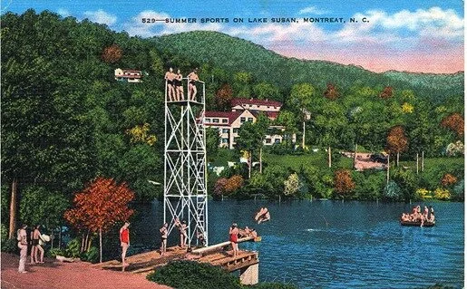 A postcard from the 1930s entitled “Summer Sports on Lake Susan, Montreat, N.C.” depicts a typical day on the water in the conference center when a diving platform was a feature of the lake. Image courtesy of Mary McPhail Standaert